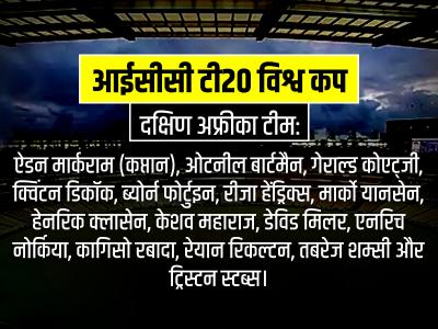 14- दक्षिण अफ्रीका टीम: ऐडन मार्कराम (कप्तान), ओटनील बार्टमैन, गेराल्ड कोएट्जी, क्विंटन डिकॉक, ब्योर्न फोर्टुइन, रीजा हेंड्रिक्स, मार्को यानसेन, हेनरिक क्लासेन, केशव महाराज, डेविड मिलर, एनरिच नोर्किया, कागिसो रबादा, रेयान रिकल्टन, तबरेज शम्सी और ट्रिस्टन स्टब्स। रिजर्व: नांद्रे बर्गर और लुंगी एनगिडी।