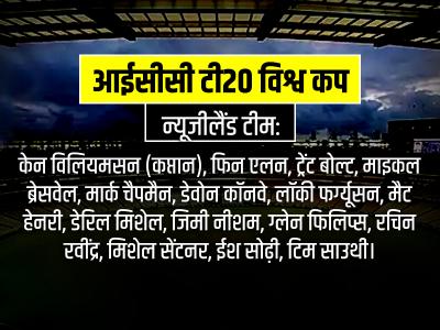 17- न्यूजीलैंड टीम: केन विलियमसन (कप्तान), फिन एलन, ट्रेंट बोल्ट, माइकल ब्रेसवेल, मार्क चैपमैन, डेवोन कॉनवे, लॉकी फर्ग्यूसन, मैट हेनरी, डेरिल मिशेल, जिमी नीशम, ग्लेन फिलिप्स, रचिन रवींद्र, मिशेल सेंटनर, ईश सोढ़ी, टिम साउथी। ट्रैवलिंग रिजर्व: बेन सियर्स।