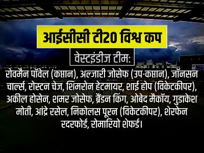आईसीसी टी20 विश्व कपः सभी कप्तान और खिलाड़ियों की लिस्ट 1- वेस्टइंडीज टीम: रोवमैन पॉवेल (कप्तान), अल्जारी जोसेफ (उप-कप्तान), जॉनसन चार्ल्स, रोस्टन चेज, शिमरोन हेटमायर, शाई होप (विकेटकीपर), अकील होसेन, शमर जोसेफ, ब्रैंडन किंग, ओबेद मैकॉय, गुडाकेश मोती, आंद्रे रसेल, निकोलस पूरन (विकेटकीपर), शेरफेन रदरफोर्ड, रोमारियो शेफर्ड।