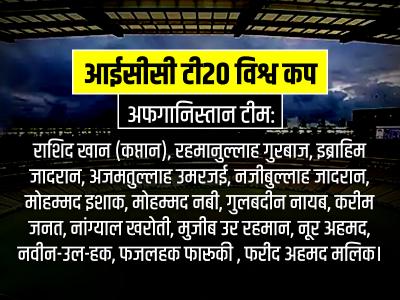 20- अफगानिस्तान टीम: राशिद खान (कप्तान), रहमानुल्लाह गुरबाज, इब्राहिम जादरान, अजमतुल्लाह उमरजई, नजीबुल्लाह जादरान, मोहम्मद इशाक, मोहम्मद नबी, गुलबदीन नायब, करीम जनत, नांग्याल खरोती, मुजीब उर रहमान, नूर अहमद, नवीन-उल-हक, फजलहक फारूकी , फरीद अहमद मलिक। रिजर्व: सेदिक अटल, हजरतुल्लाह जजई, सलीम सफी।