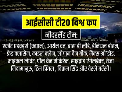 2- नीदरलैंड टीम: स्कॉट एडवर्ड्स (कप्तान), आर्यन दत्त, बास डी लीडे, डेनियल डोरम, फ्रेड क्लासेन, काइल क्लेन, लोगान वैन बीक, मैक्स ओ'डोड, माइकल लेविट, पॉल वैन मीकेरेन, साइब्रांड एंगेलब्रेक्ट, तेजा निदामानुरु, टिम प्रिंगल , विक्रम सिंह और वेस्ले बर्रेसी।