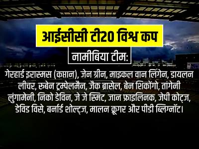 3- नामीबिया टीम: गेरहार्ड इरास्मस (कप्तान), जेन ग्रीन, माइकल वान लिंगेन, डायलन लीचर, रूबेन ट्रम्पेलमैन, जैक ब्रासेल, बेन शिकोंगो, तांगेनी लुंगामेनी, निको डेविन, जे जे स्मिट, जान फ्राइलिनक, जेपी कोट्ज, डेविड विसे, बर्नार्ड शोल्ट्ज, मालन क्रूगर और पीडी ब्लिग्नॉट।