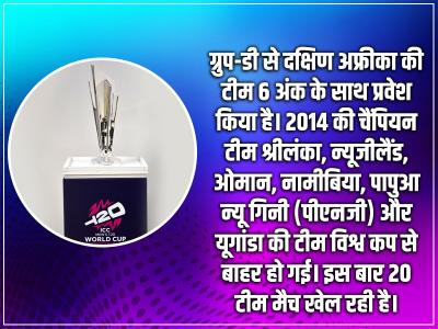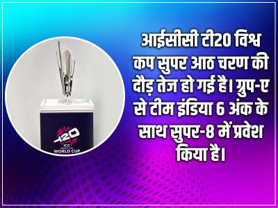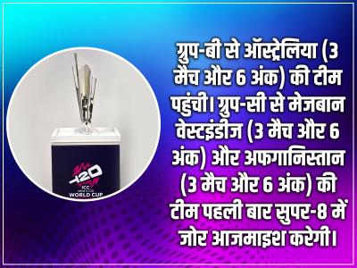 T20 World Cup 2024: आईसीसी टी20 विश्व कप सुपर आठ चरण की दौड़ तेज हो गई है। ग्रुप-ए से टीम इंडिया 6 अंक के साथ सुपर-8 में प्रवेश किया है। ग्रुप-बी से ऑस्ट्रेलिया (3 मैच और 6 अंक) की टीम पहुंची। ग्रुप-सी से मेजबान वेस्टइंडीज (3 मैच और 6 अंक) और अफगानिस्तान (3 मैच और 6 अंक) की टीम पहली बार सुपर-8 में जोर आजमाइश करेगी। ग्रुप-डी से दक्षिण अफ्रीका की टीम 6 अंक के साथ प्रवेश किया है। 2014 की चैंपियन टीम श्रीलंका, न्यूजीलैंड, ओमान, नामीबिया, पापुआ न्यू गिनी (पीएनजी) और यूगांडा की टीम विश्व कप से बाहर हो गई। इस बार 20 टीम मैच खेल रही है।