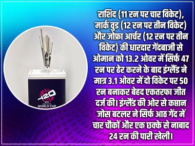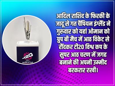 आदिल राशिद के फिरकी के जादू से गत चैंपियन इंग्लैंड ने गुरुवार को यहां ओमान को ग्रुप बी मैच में आठ विकेट से रौंदकर टी20 विश्व कप के सुपर आठ चरण में जगह बनाने की अपनी उम्मीद बरकरार रखी। राशिद (11 रन पर चार विकेट), मार्क वुड (12 रन पर तीन विकेट) और जोफ्रा आर्चर (12 रन पर तीन विकेट) की धारदार गेंदबाजी से ओमान को 13.2 ओवर में सिर्फ 47 रन पर ढेर करने के बाद इंग्लैंड ने मात्र 3.1 ओवर में दो विकेट पर 50 रन बनाकर बेहद एकतरफा जीत दर्ज की। इंग्लैंड की ओर से कप्तान जोस बटलर ने सिर्फ आठ गेंद में चार चौकों और एक छक्के से नाबाद 24 रन की पारी खेली।