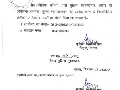 जिसमें डीजीपी का फोन नंबर जारी कराया गया, साथ ही बताया गया कि इन नंबर पर कॉल कर डीजीपी से बात की जा सकती है. डीजीपी कार्यालय की ओर से जारी नोटिफिकेशन में लिखा है, 'प्रेस और मीडिया कर्मी पुलिस महानिदेशक बिहार से आवश्यक बातचीत, किसी भी सूचना एवं जानकारी हेतु फोन नंबर 09431602302 और टेलीफोन नंबर 0612- 2294301/ 2294302 पर संपर्क कर सकते हैं.'