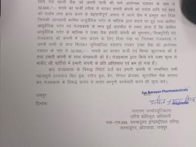जयपुरःराजस्थान की एक प्रतिष्ठित आयुर्वेदिक कंपनी, नारायण फार्मास्युटिकल्स, के लखनऊ स्थित सेल्स ऑफिसर पर गंभीर फर्जीवाड़े के आरोप लगे हैं। कंपनी ने आरोप लगाया है कि उनके लखनऊ डिस्ट्रीब्यूटर द्वारा दिए गए सिक्योरिटी चेक को चुराकर सेल्स ऑफिसर तेजप्रकाश ने अपनी पत्नी के नाम पर फर्म "अयोग्य दवा घर" नामक खाते की डिटेल्स भरा और बैंक अकाउंट में जमा कर दिया।