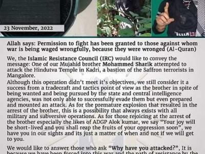 इस्लामिक रेजिस्टेंस काउंसिल’’ (आईआरसी) ने यह भी कहा कि उसके ‘मुजाहिद भाई मोहम्मद शारिक’ ने ‘कादरी में एक हिंदू मंदिर’ पर हमले की कोशिश की थी।