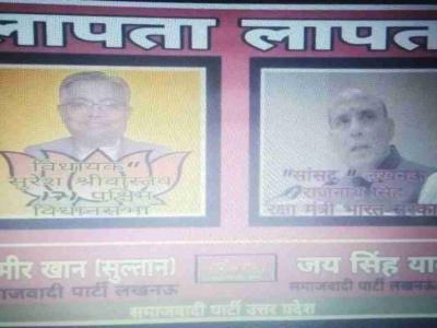 समाजवादी पार्टी के दो कार्यकर्ताओं को केंद्रीय रक्षा मंत्री राजनाथ सिंह और लखनऊ से बीजेपी विधायक सुरेश श्रीवास्तव के 'लापता' पोस्टर चिपकाने के आरोप में गिरफ्तार किया गया है।