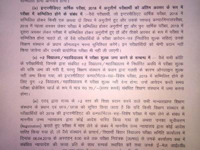 स्पेशल परीक्षा:बिहार बोर्ड ने इस परीक्षा में उन सभी अभ्यर्थीयों को भी शामिल होने का मौका दिया है जो किसी कारणवश परीक्षा नहीं दे पाए थे। इस परीक्षा का रिजल्ट भी मई अंत तक दे दिया जाएगा जिससे कि छात्रों को आगे उच्च शिक्षा प्राप्त करने में कोई परेशानी ना हो। बिहार बोर्ड की ओर से जारी सूचना में ऐसे सभी परीक्षार्थियों को दोबारा परीक्षा शुल्क नहीं देना होगा।