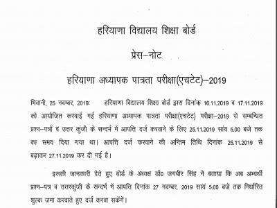 बीएसईएस ने हरियाणा टीईटी या टेट की परीक्षा 16 नवंबर 2019 से 17 नवंबर 2019 को आयोजित करवाई गई थी। इस परीक्षा से संबंधित प्रश्न -उत्तर कुंजी के संदर्भ परीक्षार्थी अपनी शिकायत दर्ज कर सकता हैं। इसे लेकर बीएसईएच की आधिकारिक वेबसाइट पर इसके संदर्भ में नोटीफिकेशन जारी की है।