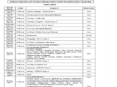 इसके मुताबिक इंडियन सर्टिफिकेट ऑफ सेकेंडरी एजुकेशन (ICSE) यानी कक्षा 10वीं की परीक्षा 5 मई से जून के बीच आयोजित की जाएगी। वहीं, इंडियन स्कूल सर्टिफिकेट (ISC) यानी 12वीं की परीक्षा 8 अप्रैल से 16 जून के बीच आयोजित होगी। देखें पहले 10वीं और फिर नीचे 12वीं की परीक्षा के टाइमटेबल...