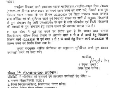 उत्तर प्रदेश शासन की अपर मुख्य सचिव (बेसिक शिक्षा) रेणुका कुमार ने शुक्रवार को बेसिक शिक्षा अनुभाग के महानिदेशक को पत्र लिखकर सरकार के फैसले से अवगत कराया है। रेणुका ने अपने पत्र में कहा है कि शासन द्वारा सम्यक विचार के बाद तय किया गया है कि बेसिक शिक्षा विभाग के अन्तर्गत कक्षा छह से कक्षा आठ तक के बच्चों के लिए विद्यालयों में दस फरवरी से पढ़ाई शुरू की जाए। उन्होंने कहा कि बेसिक शिक्षा विभाग के स्कूलों में कक्षा एक से कक्षा पांच तक की पढ़ाई एक मार्च से शुरू की जाएगी।