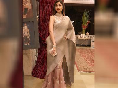 वेस्टर्न हो या इंडियन, शिल्पा हर लुक को अच्छे से कैरी करती हैं। हल्के कलर वाली साड़ी के साथ हल्के रंग का ही 'बोटनैक ब्लाउज' पहन शिल्पा अपनी उम्र से काफी कम की दिखाई दे रही हैं। इसके साथ ही उन्होंने सीधे हाथ में केवल एक ब्रेसलेट पहना है। ये एक परफेक्ट गर्लिश लुक बन सकता है आपके लिए।