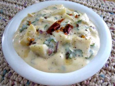 - आलुओं को छोटे-छोटे टुकड़ों में काट लें, दही में पानी डालकर अच्छी तरह फेंट लें