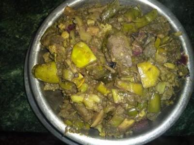 - अब सारी कटी हुई सब्जियां डालिये, आलू, बैगन और केला भी काट कर डाल दें