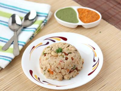 सूजी उपमा, जिसे आप ताज़ा सब्जियों, मसालों, दाल, खुशबूदार नट्स और कढ़ी पत्ता में बना सकते हैं। ऊपर से नारियल को कद्दूकस कर गार्निशिंग के लिए इस्तेमाल कर सकते हैं।