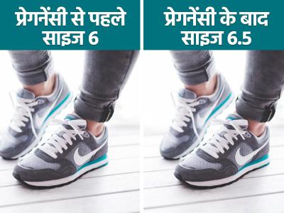 5) प्रेगनेंसी के दौरान महिला की वेस्ट और ब्रेस्ट का साइज ही नहीं बढ़ता है बल्कि उसके पैरों का साइज भी बढ़ जाता है। ऐसा शरीर में अत्यधिक तरल संचय और हार्मोनल परिवर्तन के कारण होता है।