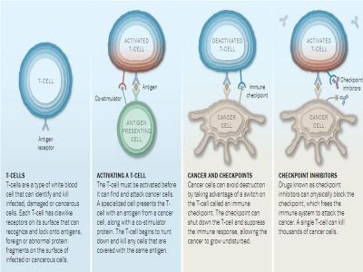 चेकपॉइंट इनहिबिटर से एडवांस मेलेनोमा (स्किन कैंसर), होडकिन लिम्फोमा और फेफड़ों, गुर्दे, मूत्राशय और सिर और गर्दन के कैंसर का इलाज किया जा सकता है। कई अन्य प्रकार के कैंसर में दवाओं का परीक्षण किया जा रहा है। अब तक, सेल थेरेपी का प्रयोग ज्यादातर ल्यूकेमिया और लिम्फोमा जैसे ब्लड क्त कैंसर के लिए किया जाता है।