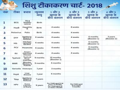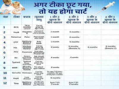 यह चार्ट भी दो पार्ट्स में बंटा हुआ है। पहला अगर आप बच्चे को पहला टीका देना भूल गए, तो क्या करें? दूसरा अगले टीके के बीच का अंतराल।