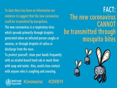 वर्ल्ड हेल्थ ऑर्गेनाइजेशन के अनुसार, आज तक इस बात की कोई जानकारी नहीं है और न ही इस बात का कोई सबूत है कि नए कोरोनो वायरस को मच्छरों द्वारा प्रेषित किया जा सकता है।