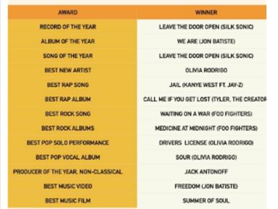 'लीव द डोर ओपन' के लिए ब्रूनो मार्स और ऐंडरसन .पाक के ग्रुप सिल्क सोनिक को 'रिकॉर्ड ऑफ द इयर' और 'सॉन्ग ऑफ द इयर' पुरस्कार दिया गया। गौरतलब है कि कोविड की वजह से इस समारोह को जनवरी के बजाय अप्रैल में आयोजित किया गया। वहीं इसके आयोजन स्थल में भी बदलाव किया गया। पहले यह कार्यक्रम लॉस एंजिल्स में प्रस्तावित था जिसे बाद मे लास वेगास में स्थानांतरित कर दिया गया। शो को ट्रेवर नूह ने होस्ट किया।