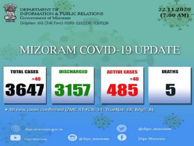 मिजोरम में कोरोना संक्रमण के पिछले 24 घंटे में 40 नए केस मिले हैं। इसी के साथ राज्य में कुल संक्रमितों की संख्या अब 3647 हो गई है। अब तक 3157 लोग ठीक होकर अस्पताल से डिस्चार्ज किए जा चुके हैं। वहीं, 5 लोगों की मौत अब तक कोरोना से राज्य में हुई है।