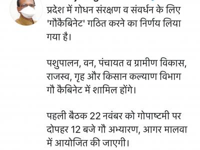 मुख्यमंत्री शिवराज सिंह चौहान ने ट्वीट कर कहा कि प्रदेश में गौधन के संरक्षण और संवर्धन के लिए गौ कैबिनेट के कठन का निर्णय लिया गया है. इस कैबिनेट ने पशुपालन, वन, पंचायत एवं ग्रामीण विकास, राजस्व, गृह एवं किसान कल्याण विभाग शामिल होंगे. इसके साथ ही गौ कैबिनेट की प्रथम बैठक गोपाष्टमी के दिन 22 नवंबर को दोपहर 12 बजे गौ अभ्यारण सालरिया आगर मालवा में आयोजित की जाएगी.