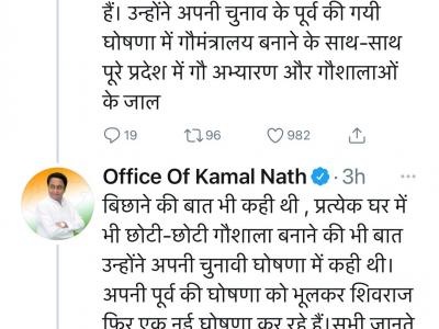 मुख्यमंत्री शिवराज सिंह चौहान के इस ट्वीट के बाद पूर्व मुख्यमंत्री कमलनाथ ने ट्वीट कर चौहान पर तंज कसते हुए कहा कि 2018 के विधानसभा चुनाव के पूर्व प्रदेश में गौ मंत्रालय बनाने की घोषणा करने वाले शिवराज सिंह अब गोधन संरक्षण व संवर्धन के लिए गौ कैबिनेट बनाने की बात कर रहे हैं.