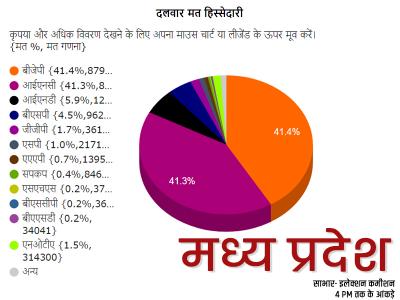 चुनाव आयोग के मुताबिक मध्य प्रदेश में आम आदमी पार्टी को 0.7 प्रतिशत वोट मिले हैं वहीं 1.5 प्रतिशत मतदाताओं ने नोटा का इस्तेमाल किया है। आम आदमी पार्टी को चार बजे तक 1,58,462 वोट हासिल हुए हैं।