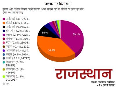 चुनाव आयोग के मुताबिक राजस्थान में आम आदमी पार्टी को 0.4 प्रतिशत वोट मिले हैं वहीं 1.4 प्रतिशत मतदाताओं ने नोटा का इस्तेमाल किया है। आम आदमी पार्टी को शाम 4 बजे तक कुल 1,17,036 वोट हासिल हुए हैं।
