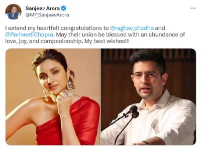 आप सांसद संजीव अरोड़ा ने दोनों की तस्वीरों के साथ ट्वीट किया, 'मैं राघव चड्ढा और परिणीति चोपड़ा को दिल से बधाई देता हूं। आशा करता हूं कि दोनों का एक-दूसरे का साथ प्यार, आनंद से भरा रहे। मेरी शुभकामनाएं!' हालांकि, इस ट्वीट पर राघव चड्ढा या परिणीति चोपड़ा की ओर से कोई प्रतिक्रिया नहीं आई है।