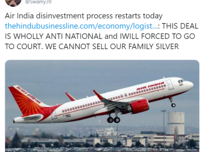 कर्ज के बोझ से लदी एअर इंडिया में 100 प्रतिशत हिस्सेदारी बेचने की निविदा सरकार ने सोमवार को जारी कर दी है। इस फैसले के बाद भारतीय जनता पार्टी (बीजेपी) के सांसद सुब्रमण्यम स्वामी ने एतराज जताया है। उन्होंने अपने ट्वीटर हैंडल पर एअर इंडिया के निजीकरण के फैसले को लेकर लिखा 'यह सौदा पूरी तरह से देश विरोधी है और मुझे कोर्ट जाने के लिए मजबूर होना पड़ेगा। हम परिवार की बेशकीमती चीज को नहीं बेच सकते।'