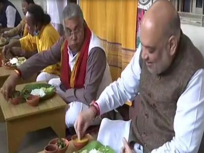 शाह पार्टी के वरिष्ठ नेताओं कैलाश विजयवर्गीय, मुकुल रॉय, दिलीप घोष, राहुल सिन्हा, अनुपम हजारा के साथ दास के घर गए और फर्श पर बैठकर दोपहर का भोजन किया। शाह ने शिव मंदिर में पूजा-अर्चना भी की। दास ने कहा, ''हम भाग्यशाली हैं कि इतनी बड़ी हस्ती हमारे घर आई। हमें बहुत खुशी हुई।'' इस दौरान सुरक्षा के कड़े प्रबंध किये गए थे।