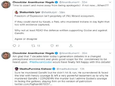 हेगड़े ने ट्वीट किया, 'मुझे खुशी है कि 7 दशक बाद आज की पीढ़ी एक बदले हुए वैचारिक माहौल में बहस करती है। नाथूराम गोडसे को भी आखिरकार इस बहस से खुशी हुई होगी!'