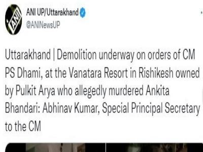 वहीं, कार्रवाई के दौरान एएनआई की ओर से बताया गया था कि सीएम के आदेश पर ये कार्रवाई की जा रही है। एएनआई के अनुसार विशेष प्रमुख सचिव अभिनव कुमार ने बताया था कि सीएम के आदेश पर पुलकित आर्य के ऋषिकेश के वनंतरा रिजॉर्ट पर बुलडोजर चलाया गया है।