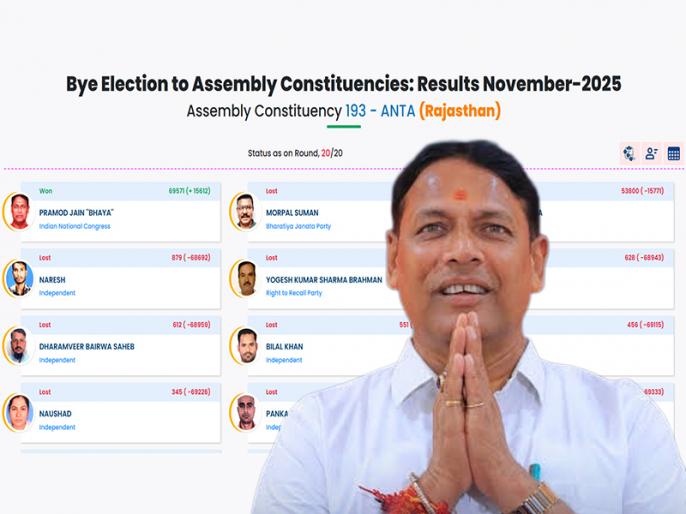 Anta: राजस्थान की अंता विधानसभा सीट पर भाजपा की हार हुई है। राजस्थान में भाजपा सरकार को हार का सामना करना पड़ा। कांग्रेस उम्मीदवार प्रमोद जैन भाया 20 चरण के बाद जीत हासिल की। 15612 वोट से भाजपा की हार हुई। प्रमोद जैन भाया को 69571 वोट मिले और भाजपा प्रत्याशी मोरपाल सुमन को 53959 मत मिले। निर्वाचन आयोग की वेबसाइट के अनुसारसत्तारूढ़ भारतीय जनता पार्टी (भाजपा) के उम्मीदवार मोरपाल सुमन दूसरे व निर्दलीय उम्मीदवार नरेश मीणा तीसरे नंबर पर रहे। मतगणना में कुल 20 चरण हुए। कुल 15 उम्मीदवार मैदान में हैं।