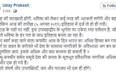 इस बीच, अवार्ड वापसी की शुरुआत करने वाले वरिष्ठ लेखक उदय प्रकाश ने फेसबुक वॉल पर लिखा है कि धरती का स्वर्ग कहा जाने वाला कश्मीर आज के दिन भारत का अभिन्न हिस्सा बन गया। उदय प्रकाश ने कहा कि कई तरह की व्याख्याएं होंगी, भविष्य को लेकर कई-कई तरह की व्याख्याएं होंगी, भविष्य को लेकर कई तरह की अटकलें लगेंगी और बहसें होंगी, लेकिन आज की तारीख़ (5 अगस्त 2019) इतिहास में दर्ज तो हो ही गयी।