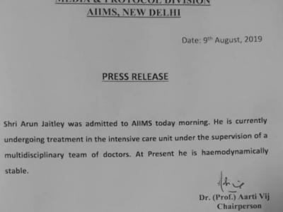 लंबे समय से बीमार चल रहे पूर्व वित्त मंत्री अरुण जेटली (66) को अखिल भारतीय आयुर्विज्ञान संस्थान (AIIMS) में आज (9 अगस्त) को भर्ती कराया गया। टीवी रिपोर्ट्स के मुताबिक जेटली को सुबह 11 बजे AIIMS में भर्ती कराया गया था। उन्हें सीएन (न्यूरो कार्डियक) सेंटर में ऐडमिट कराया गया है। रात 9 बजे एम्स ने जेटली का मेडिकल रिपोर्ट जारी किया है। एम्स ने प्रेस रिलीज कर बताया है कि अरुण जेटली को आज सुबह हॉस्पिटल में भर्ती कराया गया था। इस समय कई डॉक्टरों की निगरानी में हैं। जेटली डॉक्टरों की निगरानी में आईसीयू में हैं। वर्तमान में उनकी तबीयत स्थिर है।