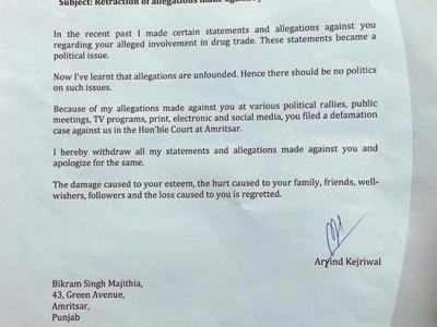 अकाली दल के दिग्गज नेता और पूर्व कैबिनेट मंत्री बिक्रम सिंह मजीठिया ने खुद एक खत को सभी के सामने दिखाया, जो उन्होंने केजरीवाल के द्वारा भेजी गई बताई। पेश की गई ये चिट्ठी आप पार्टी के लेटर हेड की है जो अरविंद केजरीवाल की और से लिखी गई थी। अरविंद केजरीवाल ने बिक्रम सिंह मजीठिया से पंजाब चुनाव प्रचार के दौरान रैलियों,मजीठिया और उनके परिवार पर लगाए गए ड्रग्स तस्करी के तमाम आरोप लगाए थे जिस पर माफी मांगी।