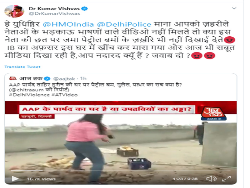 राष्ट्रीय राजधानी दिल्ली के उत्तरपूर्वी इलाके में नागरिकता संशोधन कानून (CAA) के विरोध में भड़की हिंसा के दौरान आम आदमी पार्टी (AAP) के स्थानीय पार्षद ताहिर हुसैन के घर की छत से पत्थरबाजी करने के आरोप लग रहे हैं। साथ ही साथ उनके छत पर भारी मात्रा में ईंट-पत्थर और पेट्रोल बम मिलने की तस्वीरें सामने आई हैं, जिसको लेकर कुमार विश्वास ने केंद्रीय गृह मंत्री अमित शाह से पर निशाना साधा है।