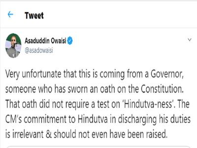 ओवैसी ने अपने आधिकारिक ट्विटर हैंडल पर लिखा, 'यह बहुत दुर्भाग्यपूर्ण है कि यह राज्यपाल द्वारा किया जा रहा है, जिसने संविधान की शपथ ली है। उस शपथ के लिए 'हिंदुत्व' की आवश्यकता नहीं थी। अपने कर्तव्यों के निर्वहन में सीएम की हिंदुत्व के प्रति प्रतिबद्धता अप्रासंगिक है और इसे उठाया भी नहीं जाना चाहिए था।'