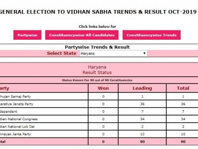 चुनाव आयोग के आंकड़ों के अनुसार दोपहर 12.45 बजे तक राज्य की 90 सदस्यीय विधानसभा में भाजपा 38, कांग्रेस 32 और जननायक जनता पार्टी 10 सीटों पर आगे चल रही है।