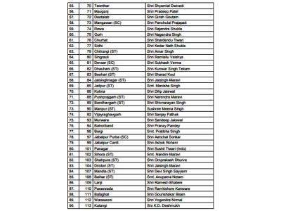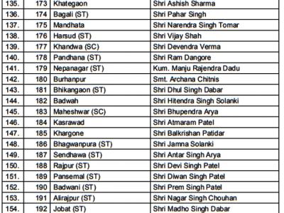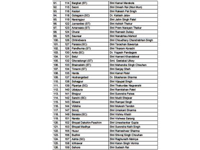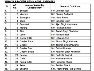 पहली लिस्ट में 177 उम्मीदवारों का एलान किया गया है। जल्दी ही 53 नामों की घोषणा की जाएगी। रिपोर्ट्स के मुताबिक इंदौर से एक भी नाम घोषित नहीं किया गया है। मुरैना से रुस्तम सिंह, श्योपुर से दुर्गालाल, लहार से रशल सिंह, गोहद से लाल सिंह आर्य और विजयपुर से सीताराम को टिकट मिला है। दतिया से नरोत्तम मिश्रा को टिकट मिला है।