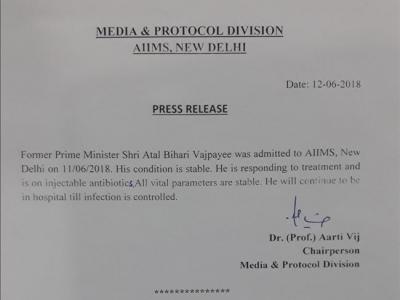 - एम्स की ओर से जारी बुलेटिन में बताया गया है कि वाजपेयी की तबीयत स्थिर है और इलाज किया जा है औप उस पर वह रिस्पॉन्ड कर रहे हैं। जब तक उनका इंफेक्शन ठीक नहीं होता है तब तक वह अस्पताल में ही रहेंगे।