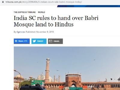 वहीं, पाकिस्तान की ट्रिब्यून डॉट कॉम डॉट पीके ने लिखा, 'भारत के सुप्रीम कोर्ट ने बाबरी मस्दिज जमीन को हिंदुओं को दिया।'