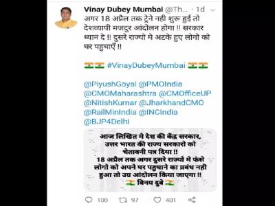 विनय दुबे ने लिखा है, '' अगर 18 अप्रैल तक ट्रेने नहीं शुरू हुई तो देशव्यापी मजदूर आंदोलन होगा। सरकार ध्यान दें। अन्य राज्यों में अटके हुए लोगों को घर पहुंचाएं।''