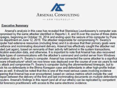 फादर स्टेन स्वामी के वकीलों द्वारा रखे गए बोस्टन स्थित एक फोरेंसिक संगठन आर्सेनल कंसल्टिंग का कहना है कि तथाकथित माओवादी पत्रों सहित लगभग 44 दस्तावेज एक अज्ञात साइबर हैकर ने लगाए थे। हैकर ने स्वामी के कंप्यूटर का पांच साल तक एक्सेस प्राप्त किया था। 2014 से शुरू होकर 2019 में तक हैकर ने स्टेन के कंम्प्यूटर तक पहुंच बनाए रखा। गौरतलब है कि इसी वक्त में जांच एजेंसी छापेमारी भी की थी।