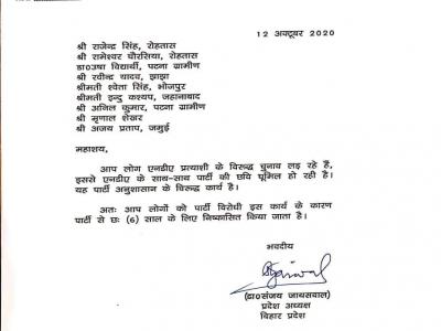 पार्टी की ओर से जारी पत्र में कहा गया है, ‘‘ आप लोग राजग के प्रत्याशी के विरूद्ध चुनाव लड़ रहे हैं। इससे राजग के साथ-साथ पार्टी की छवि भी धूमिल हो रही है। आप लोगों को दल विरोधी इस कार्य के कारण पार्टी से छह वर्ष के लिये निष्कासित किया जाता है।’’