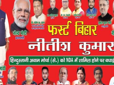 पटना: महागठबंधन छोड़ने के बाद एनडीए में एंट्री का इंतजार कर रहे पूर्व मुख्यमंत्री जीतन राम मांझी लगातार लोक जनशक्ति पार्टी पर हमलावर दिख रहे हैं. नीतीश कुमार को लेकर चिराग पासवान और उनकी पार्टी का जो स्टैंड रहा है, उस पर मांझी आक्रामक तेवर अपनाए हुए हैं और अब उनकी पार्टी हिंदुस्तानी आवाम मोर्चा ने नया पोस्टर जारी कर दिया है. मांझी की पार्टी ने 'फर्स्ट बिहार नीतीश कुमार' का नारा दिया है.