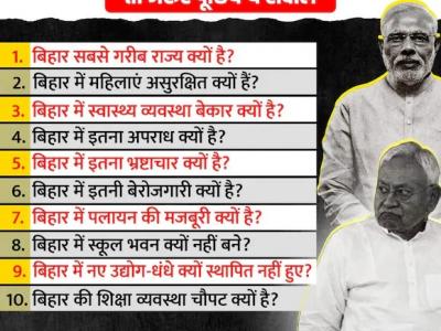 तेजस्वी यादव ने जो सवाल पूछे, वे इस प्रकार हैं- बिहार सबसे गरीब राज्य क्यों है? महिलाएं असुरक्षित क्यों हैं? स्वास्थ्य व्यवस्था बेकार क्यों है? अपराध इतना क्यों है? भ्रष्टाचार इतना क्यों है? बेरोजगारी चरम पर क्यों है? पलायन मजबूरी क्यों बना हुआ है? स्कूल भवन क्यों नहीं बनते? उद्योग क्यों नहीं आते? शिक्षा व्यवस्था इतनी जर्जर क्यों है?